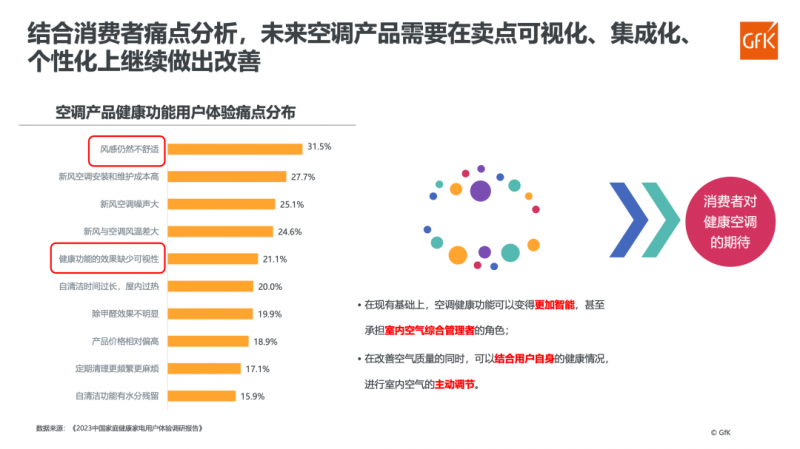 丁科技網(wǎng)注意到,從《2023中國家庭健康家電用戶體驗(yàn)調(diào)研報告》來看,消費(fèi)者對于空調(diào)產(chǎn)品健康功能的首要痛點(diǎn)是風(fēng)感不舒適,占比為31.5%,排名2-4位的痛點(diǎn)都與新風(fēng)空調(diào)有關(guān)。由此可見,新風(fēng)空調(diào)有著很大的體驗(yàn)升級空間,同時其在結(jié)合舒適風(fēng)功能的情況下,未來仍有很大的增長空間。