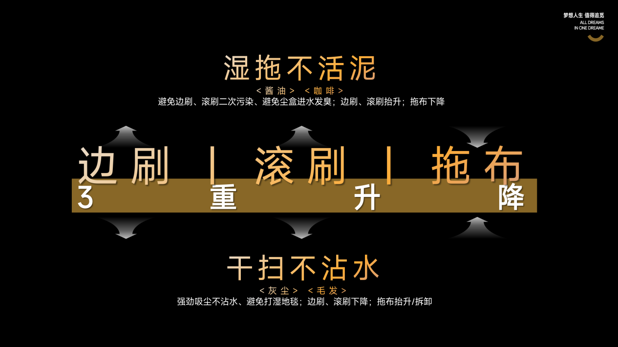 “三重升降系統(tǒng)”的應(yīng)用,真正實(shí)現(xiàn)了“干掃不沾水,濕拖不和泥”。掃地機(jī)器人在邊刷、滾刷下降掃地時,“三重升降系統(tǒng)”可以抬升或拆卸拖布,避免吸掃的灰塵雜物沾水,也避免濕拖布打濕地毯。當(dāng)掃地機(jī)器人拖布下降拖地時,“三重升降系統(tǒng)”能夠抬升邊刷、滾刷,不但可以避免邊刷、滾刷二次污染,還能避免塵盒進(jìn)水導(dǎo)致發(fā)臭。