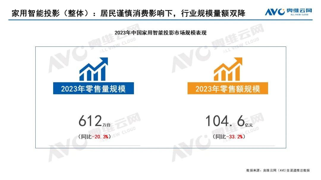 奧維云網(wǎng)(AVC)全渠道推總數(shù)據(jù)顯示,2023年中國(guó)家用智能投影零售量規(guī)模為612萬臺(tái),同比下降20.3%;零售額規(guī)模為104.6億元,同比下降33.2%,與之前幾年的高速增長(zhǎng)相比,下行勢(shì)頭明顯。