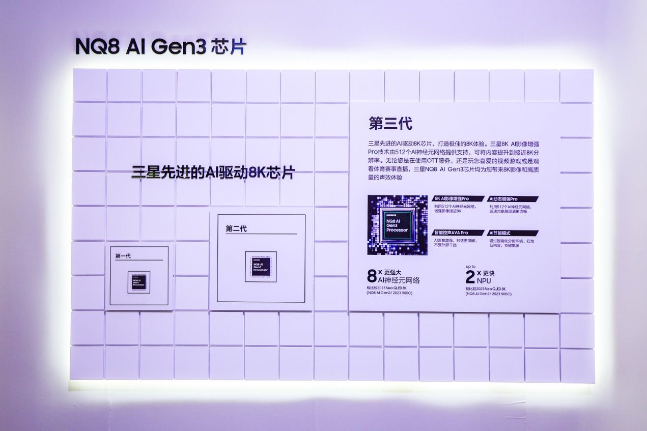 縱觀全球電視行業(yè),能進行芯片研發(fā)、制造以及終端應用的企業(yè),只有具備全產(chǎn)業(yè)鏈優(yōu)勢的三星可以做到。目前電視行業(yè)AI芯片的巔峰之作,非三星AI芯片NQ8 AI Gen3莫屬。AWE 2024上,三星也對這款AI芯片進行了介紹——作為三星最頂級的電視芯片,其NPU(神經(jīng)處理單元)速度是前代產(chǎn)品的2倍,神經(jīng)網(wǎng)絡(luò)數(shù)量從64個增加到512個。NPU速度越快,計算能力越強大;神經(jīng)網(wǎng)絡(luò)數(shù)量越多,深度學習的能力越強大。