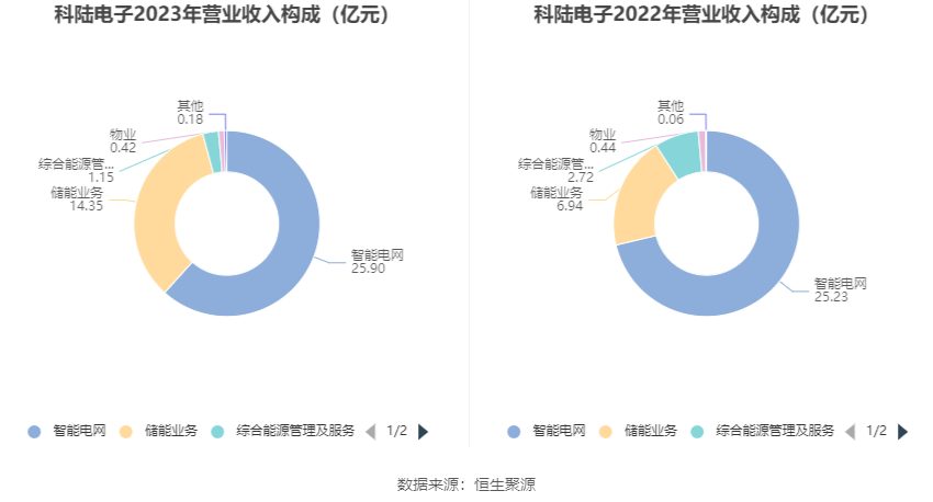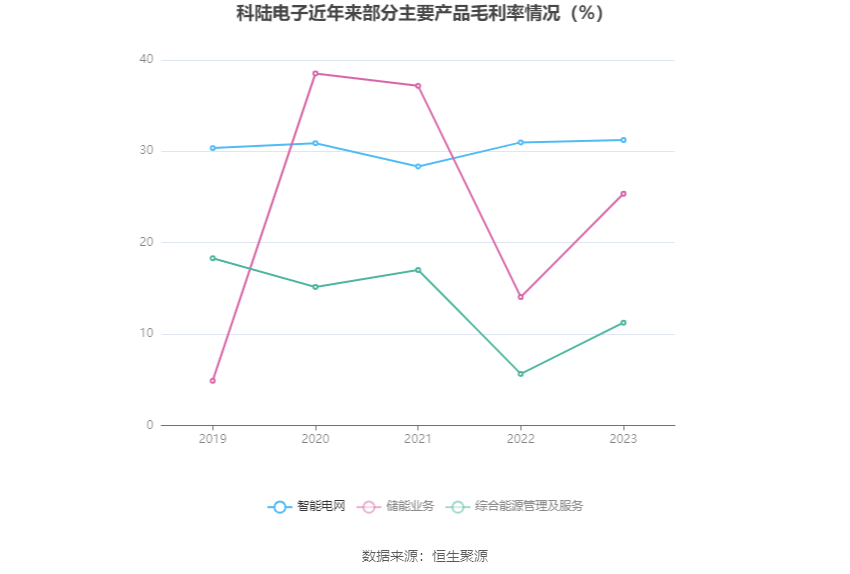 2023年,科陸電子毛利率為29.07%,同比上升2.69個(gè)百分點(diǎn)。分產(chǎn)品看,智能電網(wǎng)、儲(chǔ)能業(yè)務(wù)、綜合能源管理及服務(wù)2023年毛利率分別為31.24%、25.36%、11.25%??梢钥吹剑笾饕獦I(yè)務(wù)中,只有智能電網(wǎng)業(yè)務(wù)的毛利潤(rùn)水平高于公司毛利潤(rùn)水平,被寄予厚望的儲(chǔ)能業(yè)務(wù)毛利率低于公司毛利率水平。