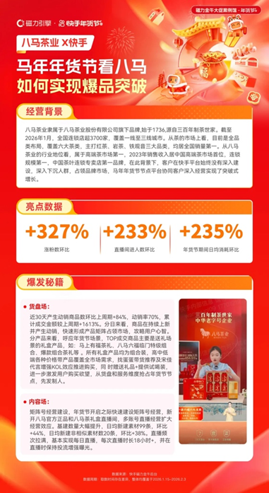 八馬茶業(yè)作為高端茶市場龍頭,線下連鎖規(guī)模龐大,但在快手平臺尚未深入下沉人群,品牌滲透不足。借助快手年貨節(jié)契機,在平臺協(xié)同下深化經(jīng)營,貨盤端聚焦送禮場景,推出多元禮盒覆蓋全價格帶,聯(lián)動達人與代言人賦能;內容端搭建矩陣號,提升直播與素材基建力度;疊加平臺扶持政策與精細化運營復盤。最終漲粉數(shù)環(huán)比增長327%,直播間進人數(shù)環(huán)比增長233%,日均消耗環(huán)比增長235%,成功實現(xiàn)快手平臺突破式增長。