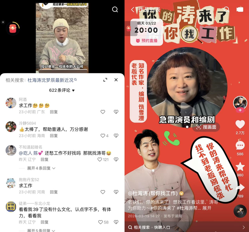 早在今年2月,杜海濤便在其快手賬號發(fā)布視頻,幫助網(wǎng)友實現(xiàn)心愿,評論區(qū)中“幫忙找份工作”的呼聲最高。3月19日,《你的濤來了-幫你找工作》節(jié)目正式官宣后,杜海濤收到大量粉絲私信——有陪老伴赴京看病、希望找份家政工作的50歲阿姨;有面臨再就業(yè)的十年工廠工人;還有渴望在一線城市立足的985名校碩士……網(wǎng)友紛紛留言:“還愁工作不好找嗎?那就找濤哥!”“太棒了,幫助普通人!”“好有意義的節(jié)目,期待!”