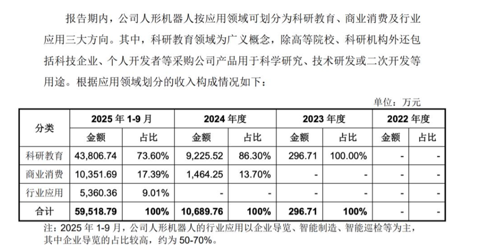 宇樹科技“關(guān)于宇樹科技股份有限公司首次公開發(fā)行股票并在科創(chuàng)板上市預(yù)先審閱申請文件的問詢函的回復(fù)”顯示,以四足機器人為例,其中科研教育的收入占比從2022年的68.61%,降低到2025年1—9月的31.58%。到2025年1—9月,商業(yè)消費、行業(yè)應(yīng)用收入占比分別提升到42.30%、26.12%,商業(yè)消費已超過科研教育,成為公司四足機器人銷售占比最大的應(yīng)用領(lǐng)域。