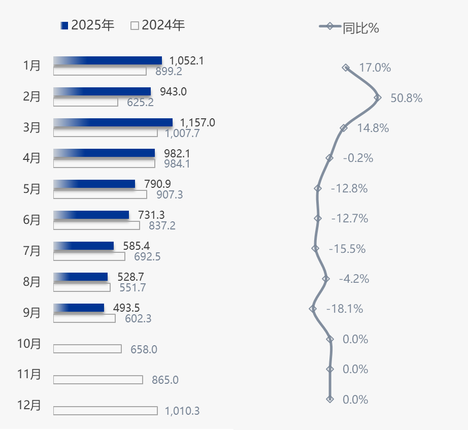 據(jù)產(chǎn)業(yè)在線監(jiān)測數(shù)據(jù)顯示,2025年9月中國家用空調(diào)生產(chǎn)1056.7萬臺,同比下滑13.5%,銷售1088.4萬臺,同比下滑10.2%,其中內(nèi)銷規(guī)模594.9萬臺,同比下滑2.5%,出口規(guī)模493.5萬臺,同比下滑18.1%。在政策銜接、需求變化以及季節(jié)性等多重影響疊加下,9月空調(diào)產(chǎn)銷雙雙下滑,短期內(nèi)承受一定壓力,但長期來看市場正在經(jīng)歷結(jié)構(gòu)化的轉(zhuǎn)型升級,行業(yè)仍在加速洗牌中。