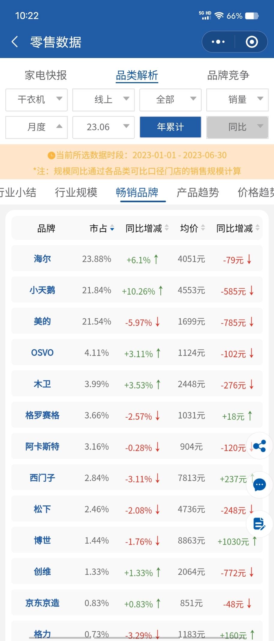 從品牌格局來看,線上市場海爾、小天鵝、美的銷量份額位列前三、地位穩(wěn)定,市場占有率分別為23.68%、21.84%、21.54%,三個品牌處于貼身纏斗狀態(tài),差距很小。不過,從增長趨勢來看,美的市場占有率下滑5.97%,而海爾、小天鵝同比份額提升6.1%、10.26%。需要注意的是,小天鵝與美的同屬美的系,因此在干衣機線上市場,美的系總體占據(jù)優(yōu)勢。