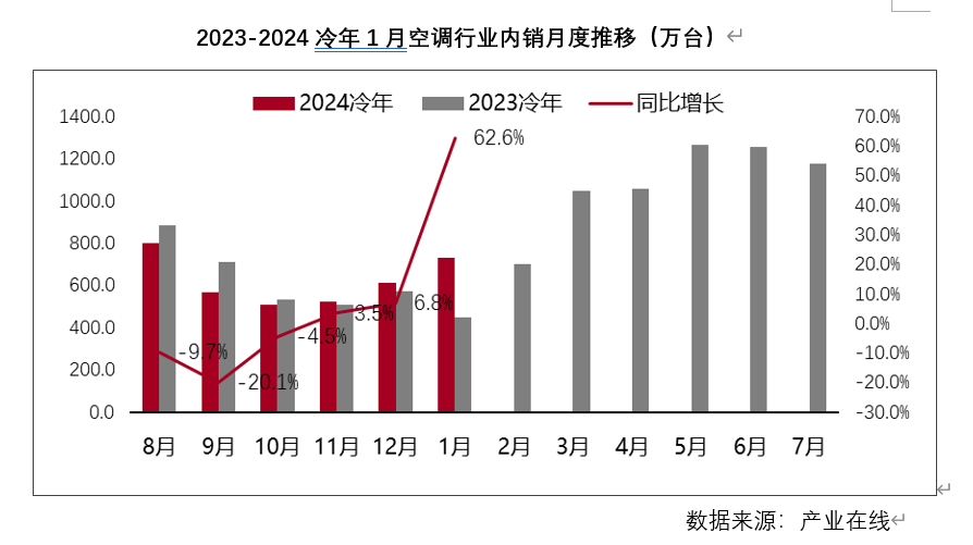 其實,1月的開門紅,有著一些“特殊原因”。一方面,2024年春節(jié)假期在2月,1月是各大品牌加力促銷的黃金銷售期,再加上返鄉(xiāng)潮下的家電換新需求增長,帶動了銷售端的增長。另一方面,考慮到春節(jié)因素,空調(diào)企業(yè)備貨前置,海外市場發(fā)貨也提前,導(dǎo)致了生產(chǎn)端的增長。正如產(chǎn)業(yè)在線分析,1月空調(diào)產(chǎn)銷大增的同比數(shù)據(jù)參考價值不大,建議關(guān)注1-2月累計數(shù)據(jù)同比情況。