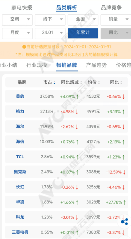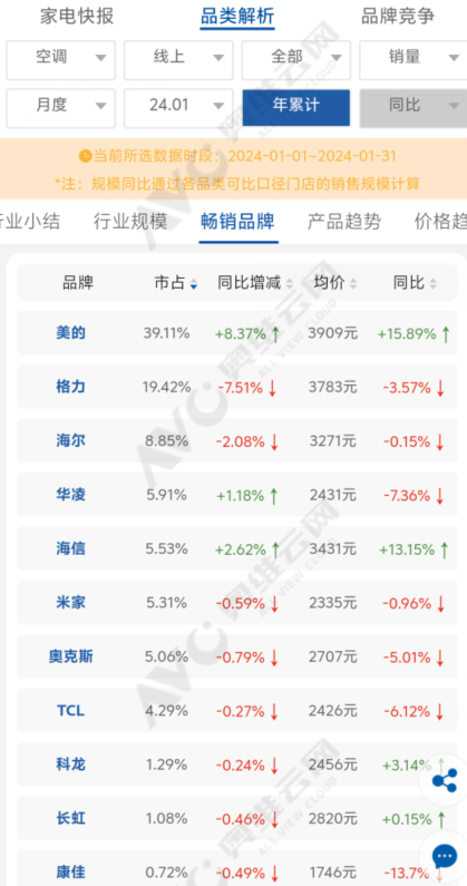 從品牌格局來看,丁科技網(wǎng)注意到,行業(yè)企業(yè)也出現(xiàn)了一些“異動”。奧維云網(wǎng)1月線上、線下銷量數(shù)據(jù)顯示,傳統(tǒng)巨頭格力空調(diào)的市場份額下滑幅度較大,其中線上渠道市場份額同比下滑7.51%,線下渠道市場份額同比下滑4.98%。值得“警惕”的是,1月格力空調(diào)線上渠道銷量市占率已經(jīng)跌破了20%。整體來看,只有美的、海信等少數(shù)幾個品牌保持了市場份額的雙線增長。當然,1月的數(shù)據(jù)異動有春節(jié)因素影響,也有不同企業(yè)市場策略不同的影響,整個市場格局仍會動態(tài)調(diào)整。