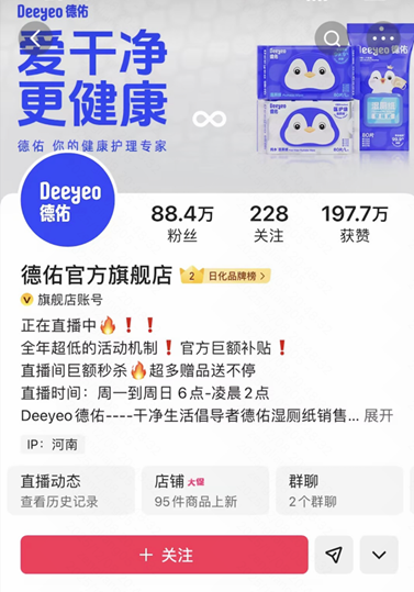 快手電商商品卡川流計(jì)劃推出至今,已助力眾多品牌商家在商城收獲精準(zhǔn)曝光和高效轉(zhuǎn)化,充分抓住平臺(tái)貨架場生意增長機(jī)遇。主打濕廁紙、嬰兒濕巾、柔紙巾等高品質(zhì)一次性衛(wèi)生用品的品牌商家德佑正是其中的代表之一。