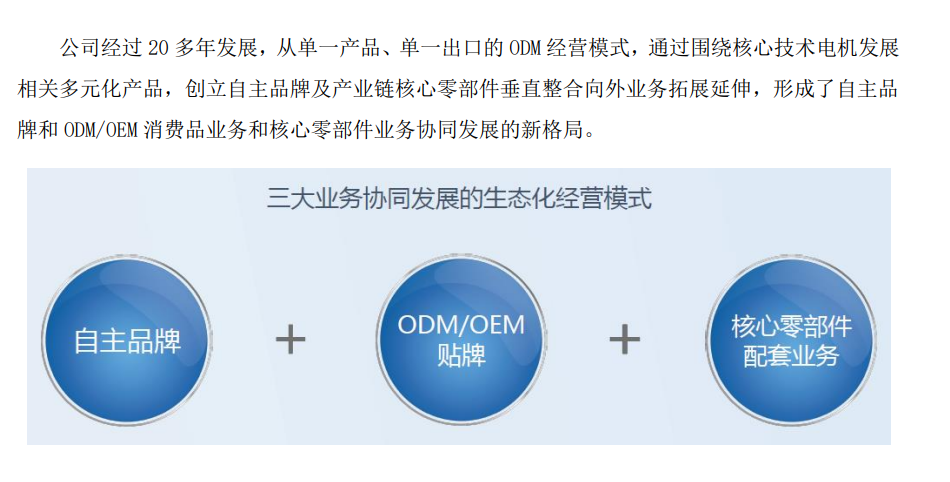 在萊克電氣2023年半年報(bào)中,披露了公司的三大業(yè)務(wù):公司經(jīng)過 20多年發(fā)展,從單一產(chǎn)品、單一出口的ODM經(jīng)營模式,通過圍繞核心技術(shù)電機(jī)發(fā)展相關(guān)多元化產(chǎn)品,創(chuàng)立自主品牌及產(chǎn)業(yè)鏈核心零部件垂直整合向外業(yè)務(wù)拓展延伸,形成了自主品牌和ODM/OEM消費(fèi)品業(yè)務(wù)和核心零部件業(yè)務(wù)協(xié)同發(fā)展的新格局。