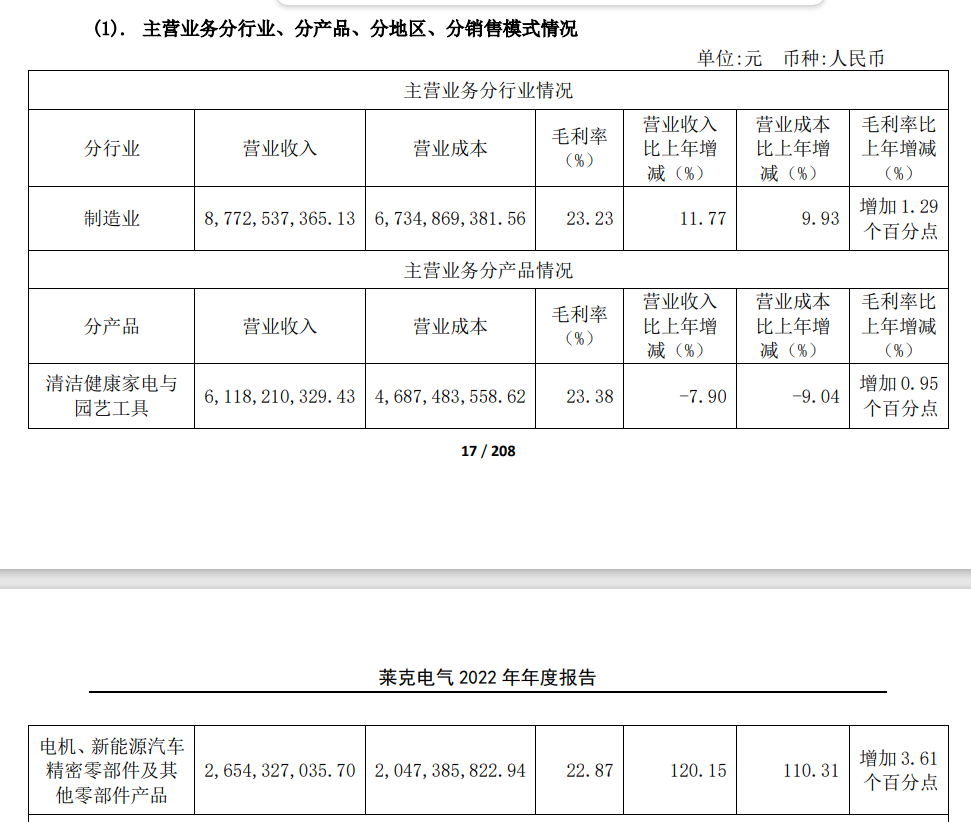 由于2023年戰(zhàn)略性放棄ODM業(yè)務(wù),也就是說萊克電氣的主要業(yè)務(wù)除了自主品牌清潔電器之外,最主要的就是核心零部件配套業(yè)務(wù)。丁科技網(wǎng)注意到,從2022年萊克電氣財(cái)報(bào)來看,清潔健康家電與園藝工具和電機(jī)、新能源汽車精密零部件及其他零部件產(chǎn)品的營收分別為61.2億元和26.5億元,占制造業(yè)總營收比重分別為70%和30%??梢钥闯?,萊克電氣的零部件業(yè)務(wù)比重相對較低,在清潔電器市場下行壓力漸增的情況下,零部件業(yè)務(wù)需要有更大的作為,才能對萊克電氣的業(yè)績形成實(shí)質(zhì)性拉升。