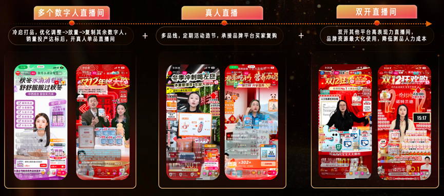 運(yùn)營層面,諾特蘭德采用矩陣化直播模式,搭建數(shù)字人與真人直播間雙開策略,遵循“冷啟打品—優(yōu)化調(diào)整—放量—復(fù)制”路徑,定期開展主題活動提升復(fù)購。數(shù)據(jù)顯示,其銷售額從單月千萬漲到單月3000萬,單日峰值達(dá)到300萬,增長勢頭強(qiáng)勁。