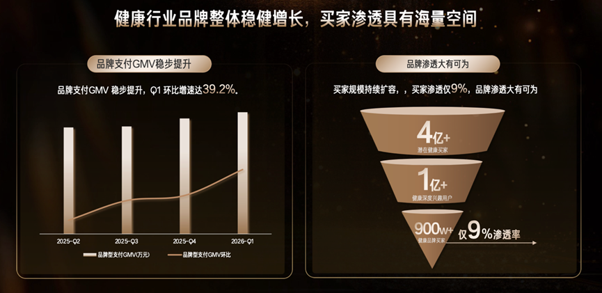 如果說品牌自身努力是內(nèi)在動力,快手平臺的藍(lán)海價值與官方扶持則是外部關(guān)鍵助力??焓肿鳛閲窦壠脚_,2025年第三季度日均活躍用戶達(dá)4.16億,用戶日均觀看時長134.1分鐘,海量活躍用戶奠定堅實流量基礎(chǔ)。更關(guān)鍵的是,快手健康行業(yè)存在巨大藍(lán)海,平臺有4億+潛在健康買家、1億+深度興趣用戶,但品牌買家僅900萬,滲透率僅9%,為諾特蘭德提供了充足增長空間。