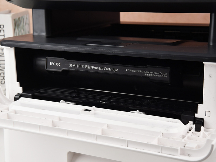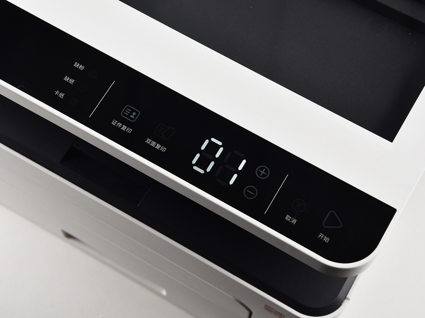 在機(jī)身中部為該產(chǎn)品的出紙單元,因采用了黑色配色,讓用戶可以很好的識別出打印文檔,較大概率上避免了打印后錯(cuò)拿忘拿的可能性。