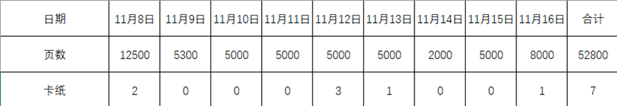 通過上表我們可以看到,在11月8日到11月16日為期9天的測試中,我們共打印了52800頁標(biāo)準(zhǔn)測試文檔,其中共出現(xiàn)過7次卡紙報(bào)錯(cuò)情況。