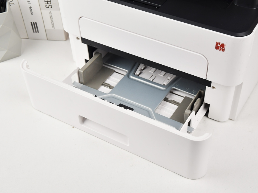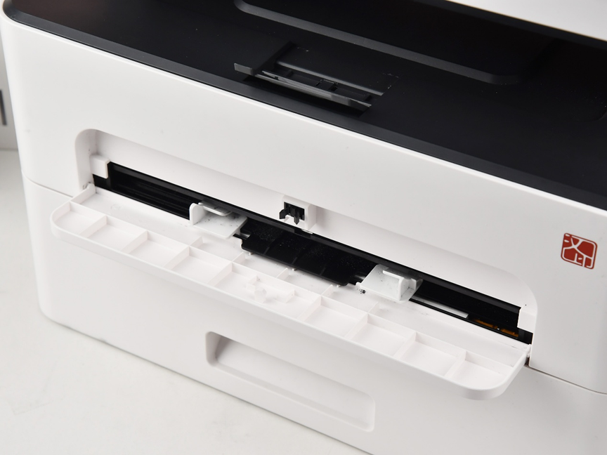 在機(jī)身中部下側(cè)為該產(chǎn)品的手動(dòng)送紙單元,該產(chǎn)品標(biāo)稱可兼容普通紙/厚紙/信封/明信片等材質(zhì)60~190g/㎡的介質(zhì),而在機(jī)身底部為該產(chǎn)品的全封閉式紙盒,該紙盒標(biāo)稱可容納250頁普通復(fù)印紙,全封閉紙盒可有效防塵防潮外,如此大容量的紙盒更是提升了產(chǎn)品的續(xù)航能力。