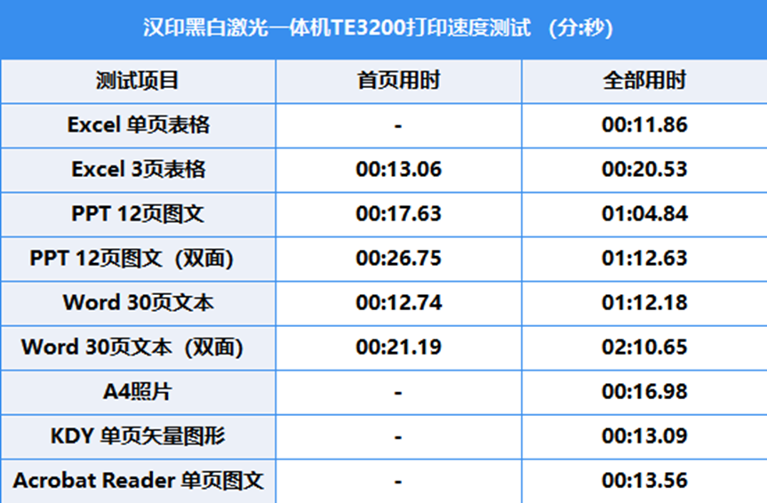 除了5萬頁的耐用性測試外,我們更換了一套全新的硒鼓耗材,對漢印黑白激光一體機(jī)TE3200進(jìn)行了標(biāo)準(zhǔn)的打印速度測試,具體請看下表: