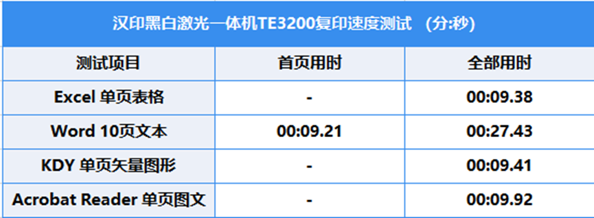 在復(fù)印測試中,我們對該產(chǎn)品進(jìn)行了多種覆蓋率樣張和多頁復(fù)印的測試,通過上表我們可以看到無論是覆蓋率多少,漢印黑白激光一體機(jī)TE3200的首頁復(fù)印時(shí)間皆能較好的控制在9秒左右,而Word 10頁文檔樣張的復(fù)印中,全部僅用時(shí)27秒,在市場中同類產(chǎn)品表現(xiàn)較為搶眼。