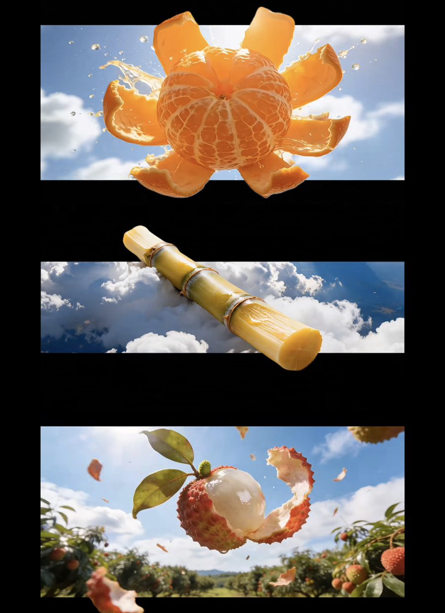這種表達(dá)上的轉(zhuǎn)向,和他平時(shí)的觀看習(xí)慣有關(guān)。他提到,自己很喜歡看《舌尖上的中國(guó)》這類紀(jì)錄片,喜歡那種從勞作到收獲、從土地到餐桌的真實(shí)質(zhì)感。在他看來,很多傳統(tǒng)三農(nóng)視頻信息足夠直接,但畫面表達(dá)相對(duì)單一,更多是對(duì)著水果、作物和種植過程做講解。也正因?yàn)槿绱耍_始嘗試把 AI、轉(zhuǎn)場(chǎng)和鄉(xiāng)土題材結(jié)合起來,讓鄉(xiāng)村內(nèi)容在保留真實(shí)感的同時(shí),也有更強(qiáng)的視覺吸引力。