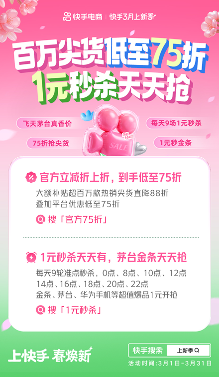 快手3月上新季正式開售:百萬尖貨低至75折 1元秒殺天天搶