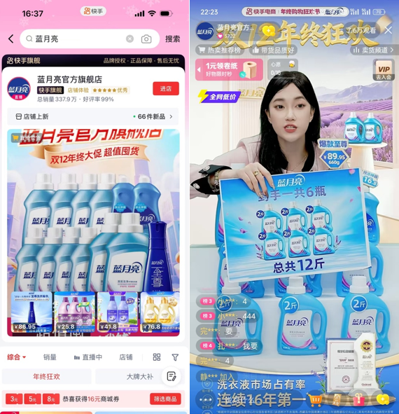 近一年,藍(lán)月亮直播GMV位居快手居家清潔行業(yè)TOP5,官旗等品牌店鋪GMV增長(zhǎng)超100%。