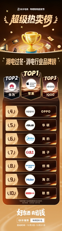 12月3日-12月11日,蘋果、華為、IQOO、OPPO、華碩、美的、揚子、創(chuàng)維、海爾、聯(lián)想成為快手消電行業(yè)TOP10熱賣品牌。