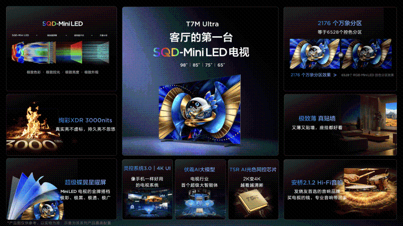 本次發(fā)布會還帶來客廳的第一臺SQD-Mini LED電視TCL T7M Ultra。作為六大維度技術(shù)進(jìn)階的全能選手,T7M Ultra搭載2176個(gè)萬象分區(qū)(分區(qū)數(shù)與6528個(gè)分區(qū)的RGB電視相等)與絢彩XDR 3000nits峰值亮度,承襲100%BT.2020全局高色域的技術(shù)基因,配合安橋2.1.2聲道Hi-Fi音響,同樣成為全能無短板的影游搭子。