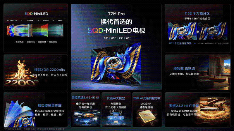 音質(zhì)方面,TCL T7M Pro搭載安橋2.1.2 聲道Hi-Fi音響,天空聲道與超重低音帶來超強(qiáng)環(huán)繞感。TSR AI光色同控芯片、4K 150Hz高刷、靈控系統(tǒng)3.0與伏羲AI大模型的18+N智能體,共同構(gòu)成了滿級配置。無論是色彩技術(shù)、屏幕素質(zhì)、分區(qū)控光、刷新率還是畫質(zhì)芯片,TCL T7M Pro都實(shí)現(xiàn)了全面進(jìn)化,成為電視換代的不二之選。價(jià)格方面,65/75/85/98英寸國補(bǔ)后入門價(jià)位直達(dá)5千元檔,將SQD-Mini LED技術(shù)帶入前所未有的親民區(qū)間。
